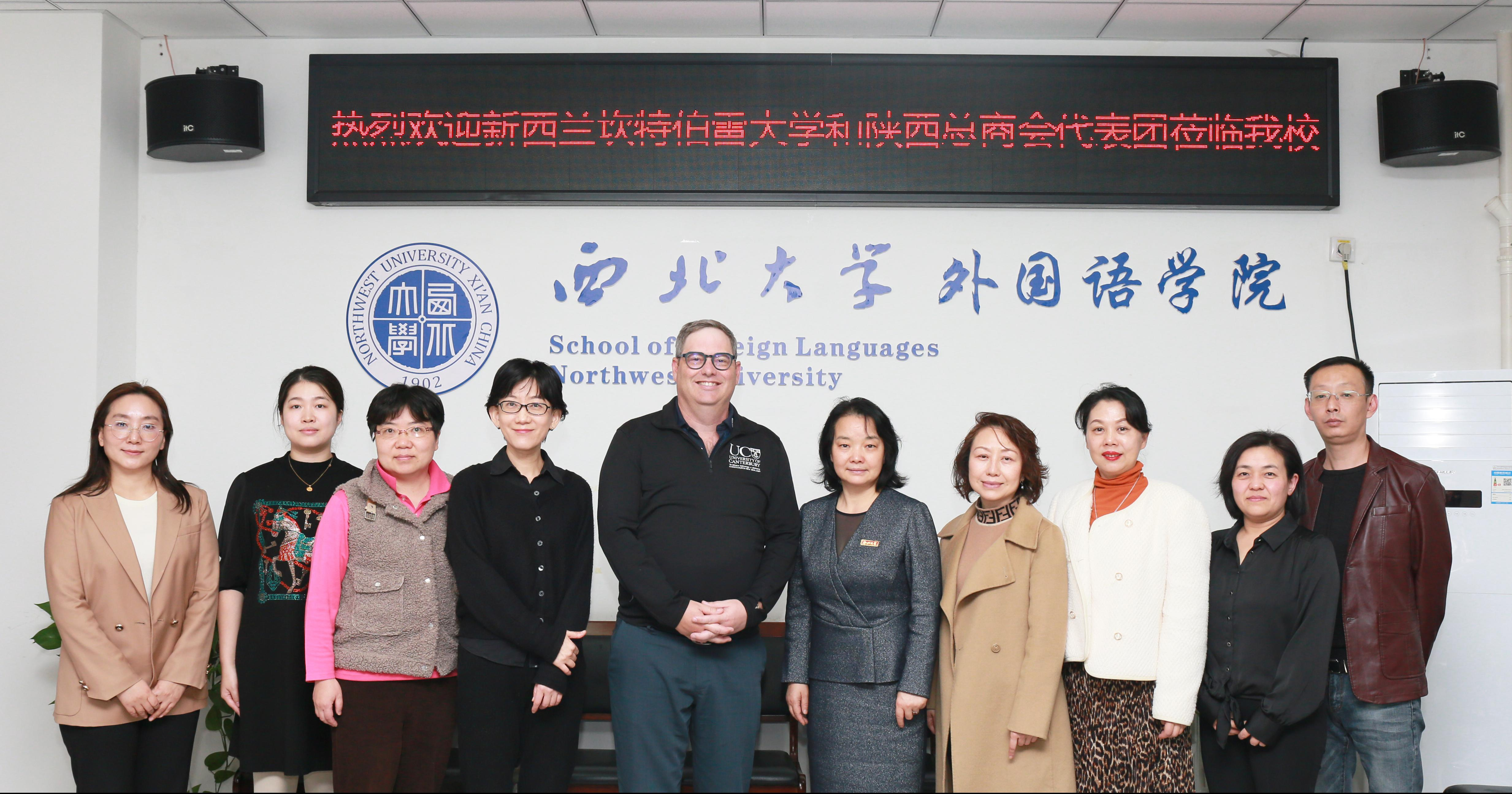 On the afternoon of November 21, 2023, Ian McDonald, Dean of the International School at the University of Canterbury in New Zealand, along with Zhao Fang, Chairman of the Shaanxi New Zealand General Chamber of Commerce, visited Northwest University. A meeting was held in the conference room on the fifth floor of the Western Learning Building to discuss topics such as educational cooperation and research on international friends. This event was organized by the Shaanxi People's Association for Friendship with Foreign Countries, coordinated by the International Cooperation Department of Northwest University, with Song Ming, Senior Inspector of the Department of American Studies at the Provincial Friendship Association, Ren Huilian, Director of the International Cooperation Department of Northwest University, and Cao Ruonan, Dean of our school, attending the meeting.