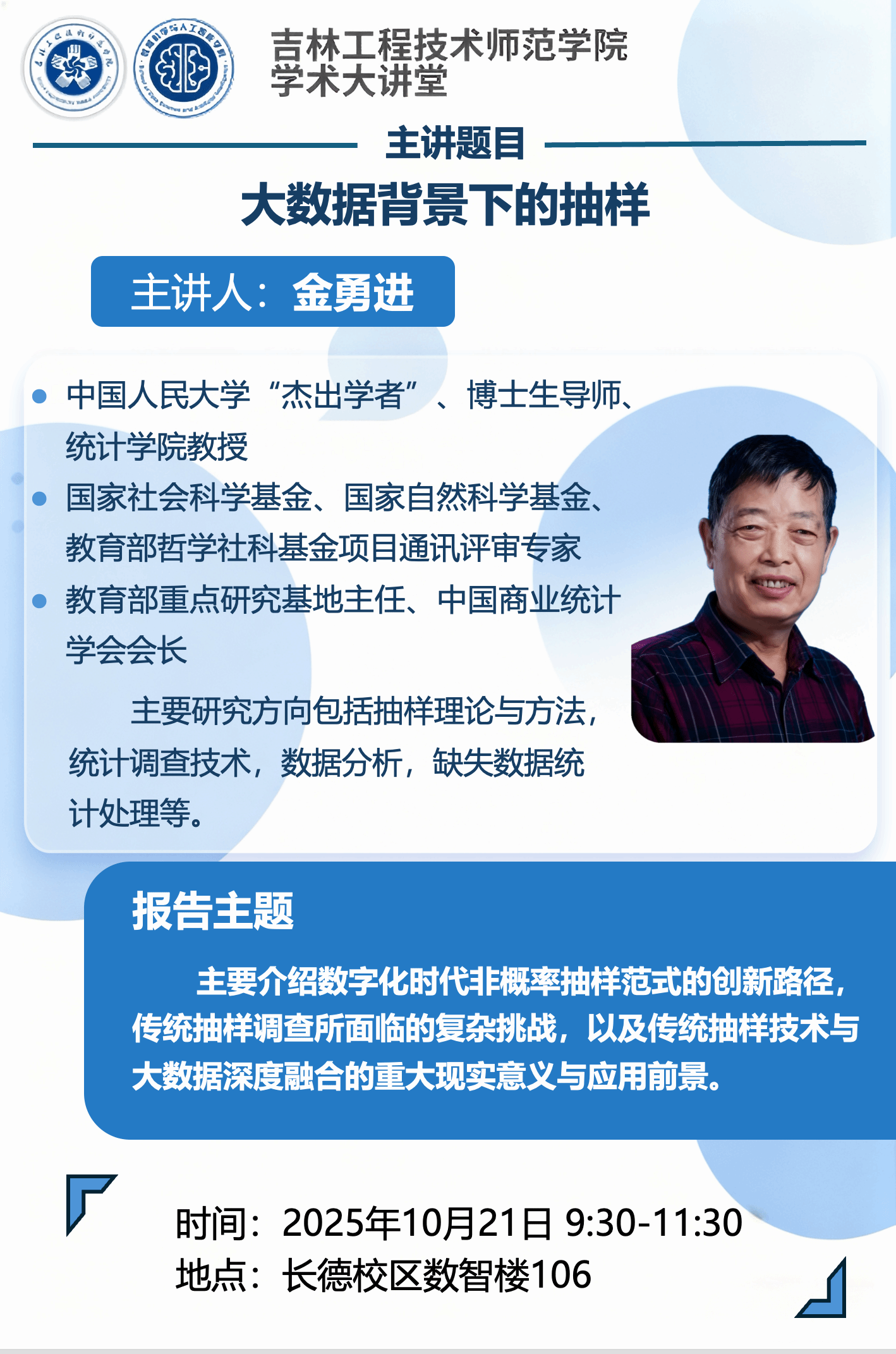 主讲人:金勇进,中国人民大学 教授时间、地点:2025年10月21日9:30,长德校区数智楼106主办单位:数据科学与人工智能学院、科研处讲座内容:1.数字化时代非概率抽样范式的创新路径;2.传统抽样调查所面临的复杂挑战;3.传统抽样技术与大数据深度融合的重大现实意义与应用前景。