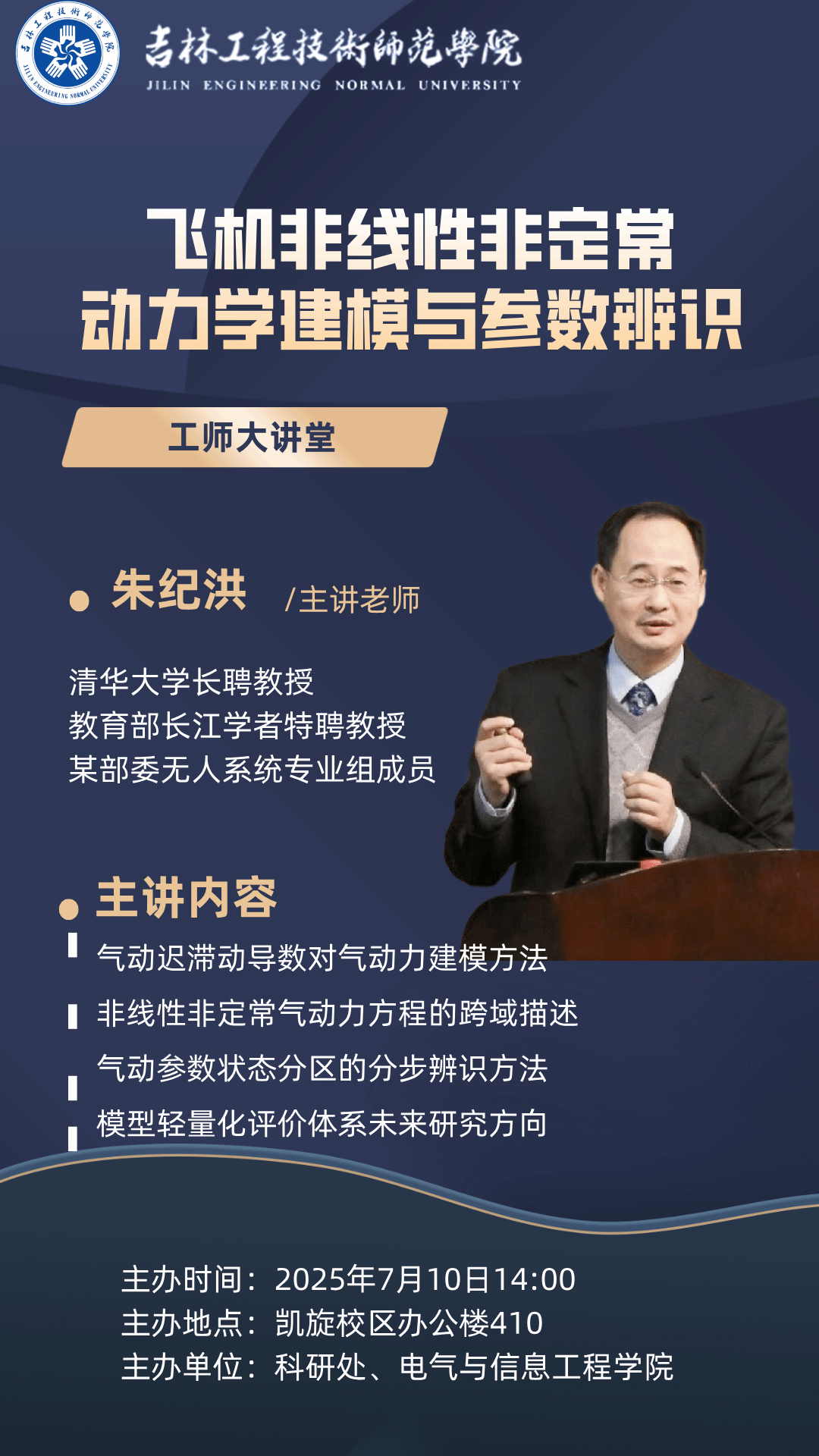 主讲人:朱纪洪,清华大学 教授时间、地点:2025年7月10日14:00, 凯旋校区办公楼410主办单位:电气与信息工程学院、科研处讲座内容:1.气动迟滞动导数对气动力建模方法;2.非线性非定常气动力方程的跨域描述;3.气动参数状态分区的分步辨识方法;4.模型轻量化评价体系未来研究方向。