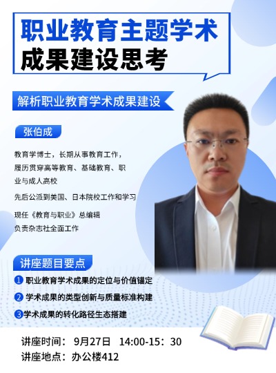 主讲人:张伯成,《教育与职业》杂志社 教授时间、地点:2025年9月27日14:00, 凯旋校区办公楼412主办单位:教育科学学院、科研处讲座内容:1.职业教育学术成果的定位与价值锚定;2.学术成果的类型创新与质量标准构建;3.学术成果的转化路径生态搭建。