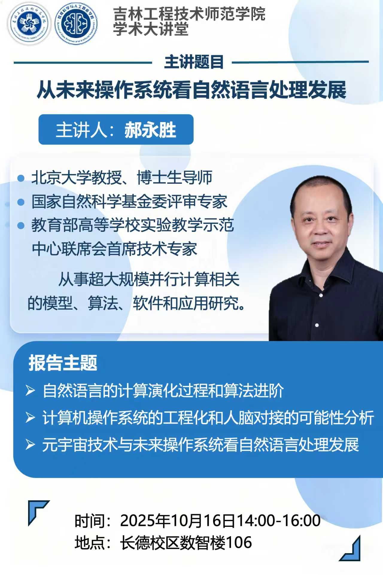 主讲人:郝永胜,北京大学 教授时间、地点:2025年10月16日14:00,长德校区数智楼106主办单位:数据科学与人工智能学院、科研处讲座内容:1.自然语言的计算演化过程和算法进阶;2计算机操作系统的工程化和人脑对接的可能性分析;3.元宇宙技术与未来操作系统看自然语言处理发展。